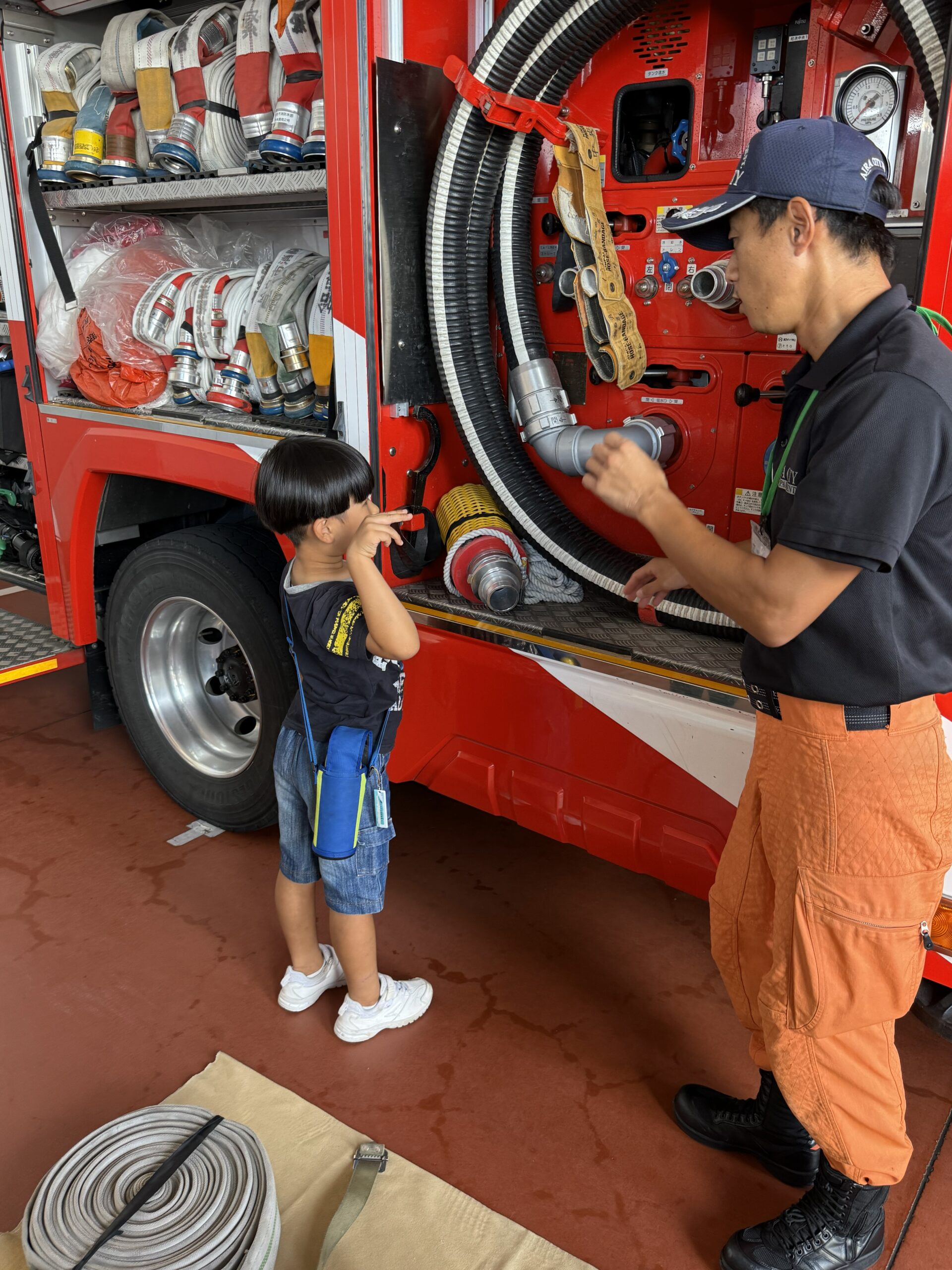 学校の遠足などで行ったことある児童もいましたが、低学年と手を繋いで消防署の方に質問したり、実際に乗り物の中を見せてもらいどのように実際に火事などがあると出動するのかお話を聞くことができました😊